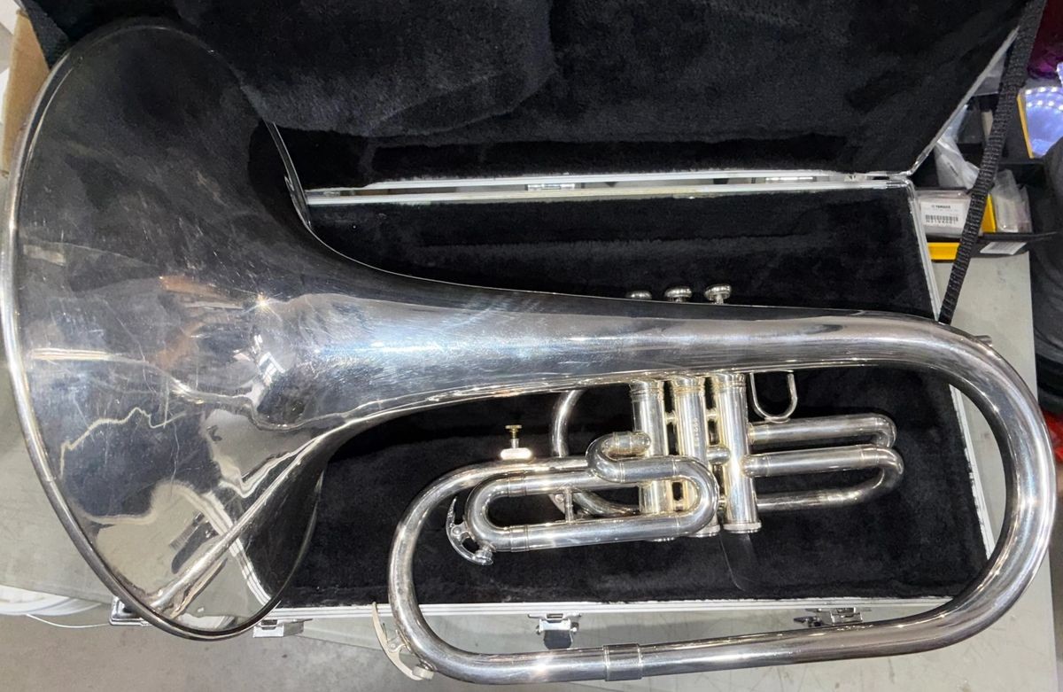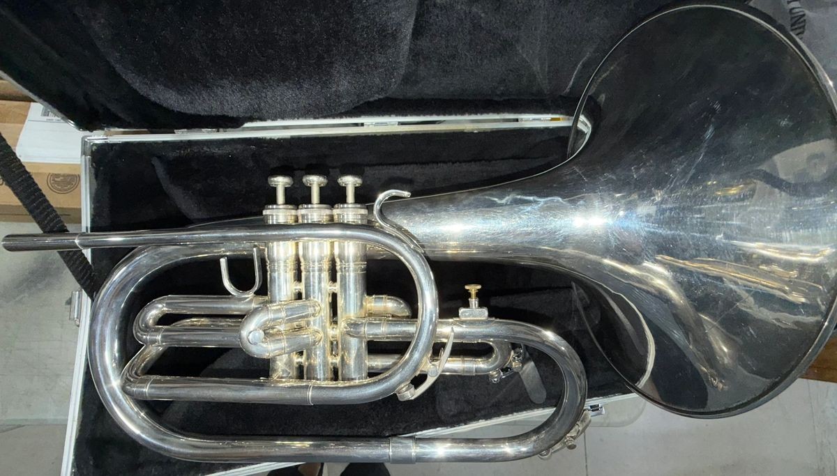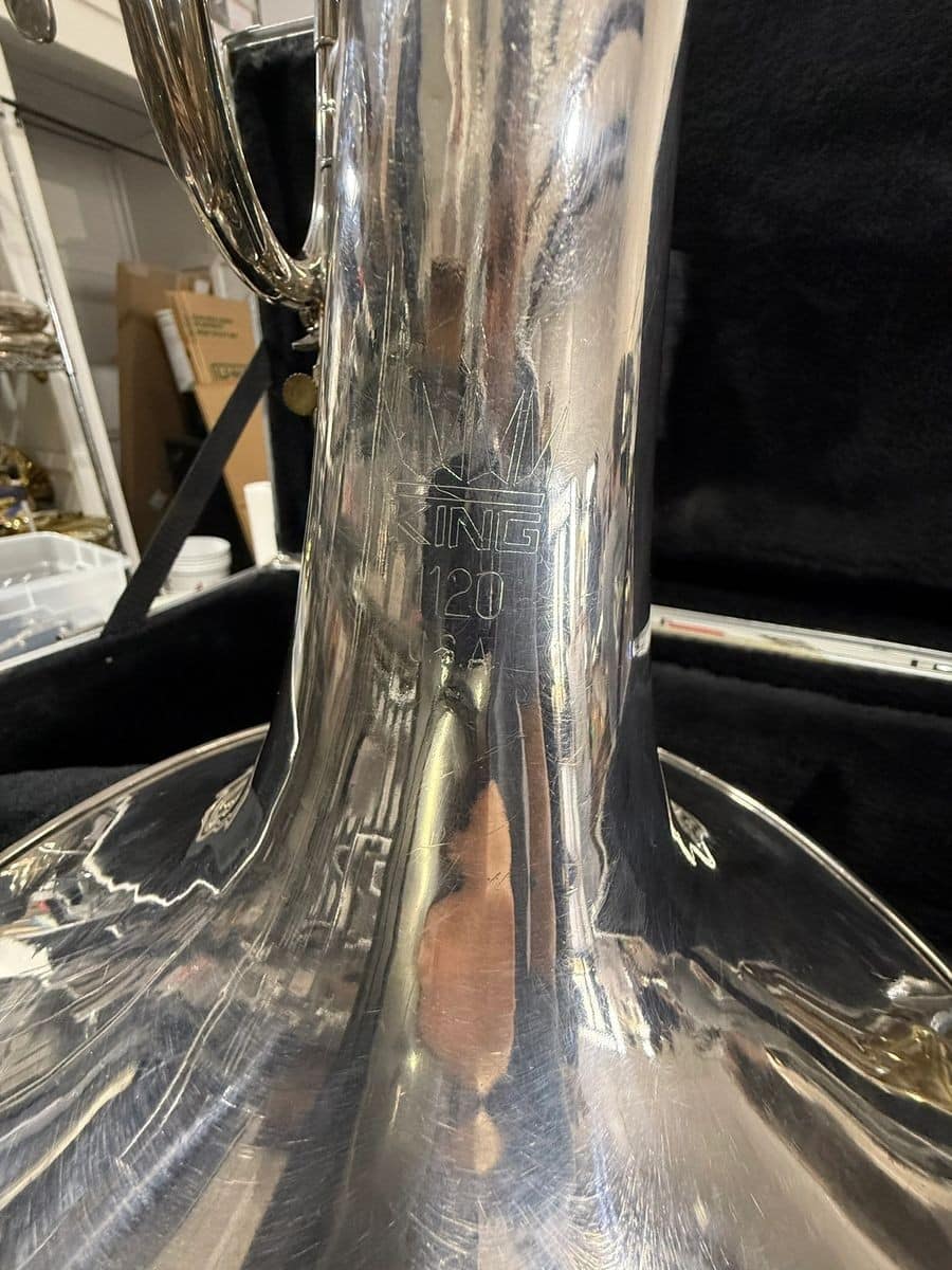 The King 1120 marching mellophone is a brass instrument in the key of F with a (0.468″) bore and a (10.5″) bell. It features nickel-plated pistons, a 1st valve thumb saddle, and an adjustable 3rd slide. It is a U.S.-made instrument that comes with a case and is suitable for beginner to advanced players.